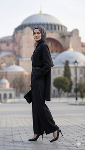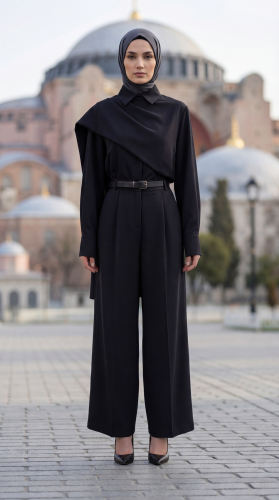 • Kadın uzun kollu şal detaylı bluz ve pantolon kemer dahil ikili takım