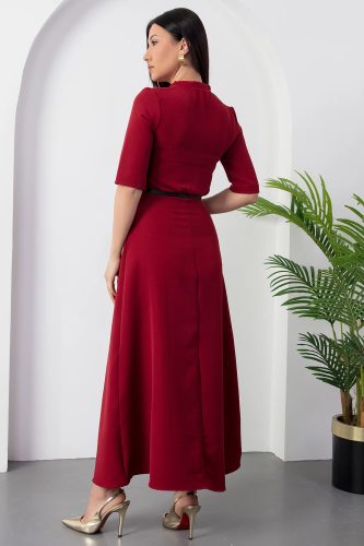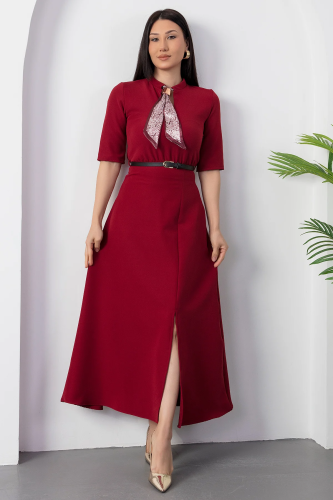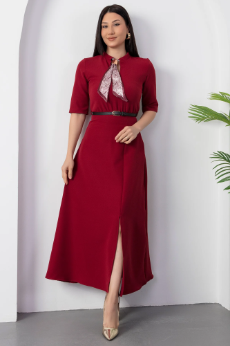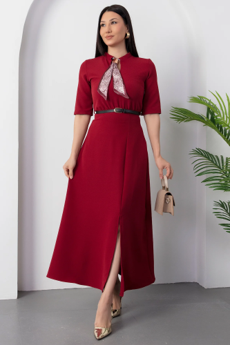 • Kadın kısa kollu fular ve kemer detay önden yırtmaçlı maxi boy elbise